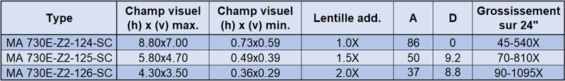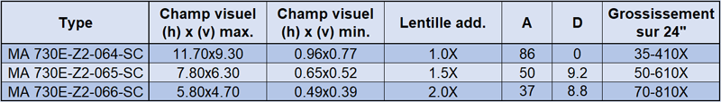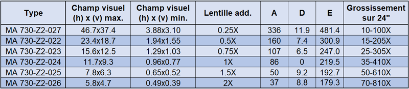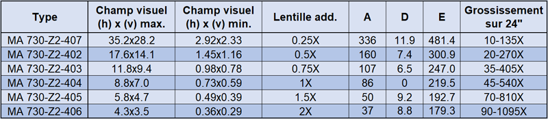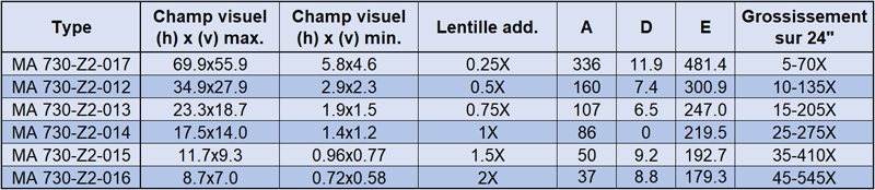 In funzione delle diverse esigenze, Marcel Aubert propone ottiche zoom con ingrandimenti e lenti addizionali come da tabella. In sede di definizione dell’offerta i nostri tecnici commerciali sapranno indicarvi quella più adatta.